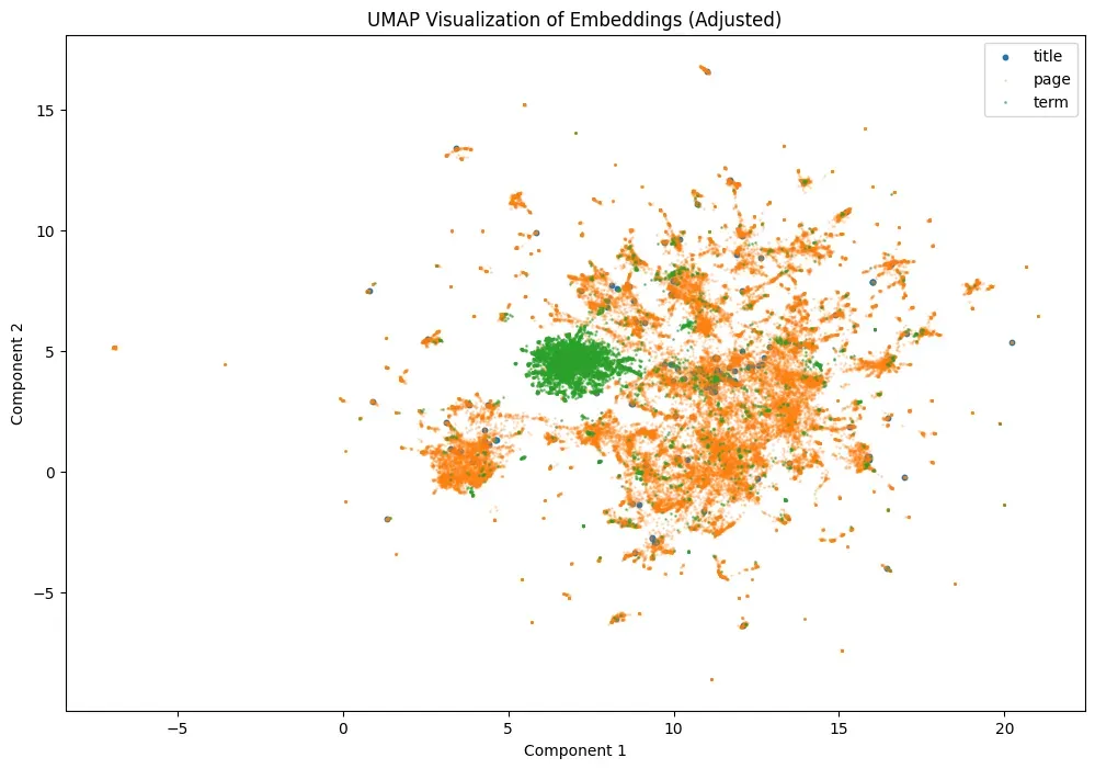 - Applying UMAP on the embeddings of titles, pages and topics in a combined space