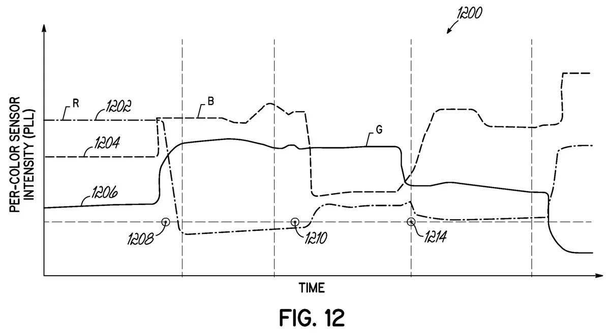 FIG. 3: Spectral response showing transmitter LED output and receiver camera responses (from US Patent 10,116,394 B2)
