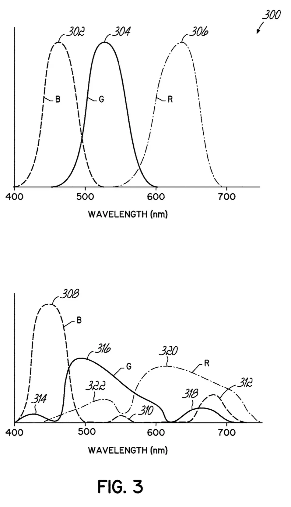 FIG. 3: Spectral response showing transmitter LED output and receiver camera responses (from US Patent 10,116,394 B2)